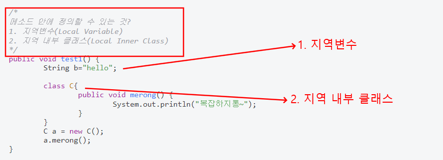 └ 메소드 안에는 지역변수, 지역내부 클래스를 정의할 수 있다.
