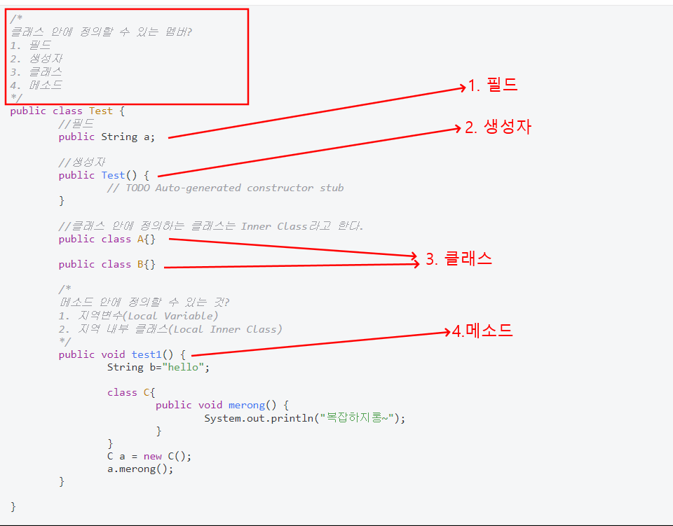 └클래스 안에는 필드, 생성자, 클래스, 메소드를 정의할 수 있다.